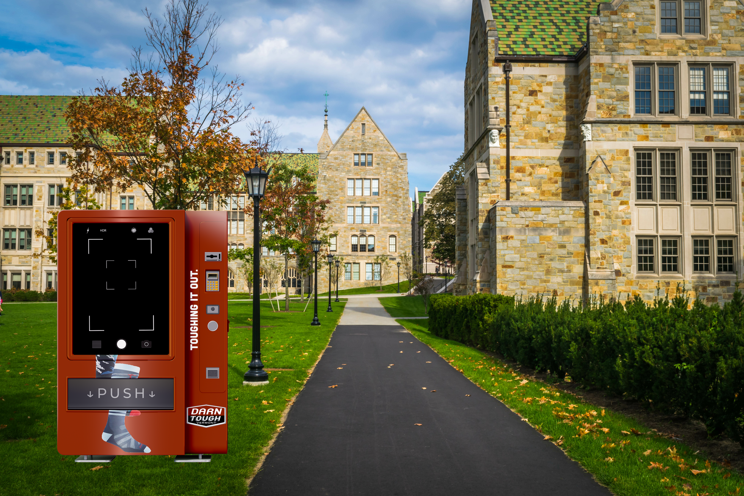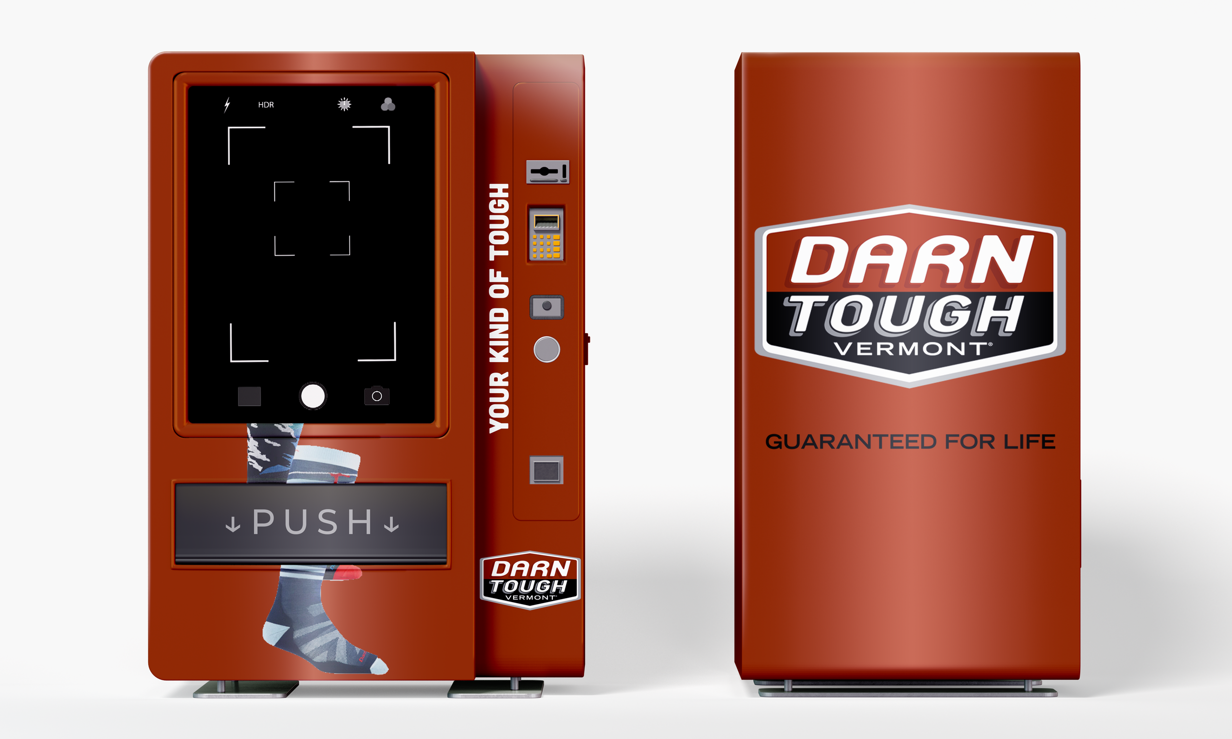 A vending machine installation placed in different locations. The machine features an interactive screen where people can enter their information and complete an on-screen challenge to win a prize, such as socks or a coupon code. Each challenge is recorded by a built-in camera, capturing participants’ reactions and engagement.