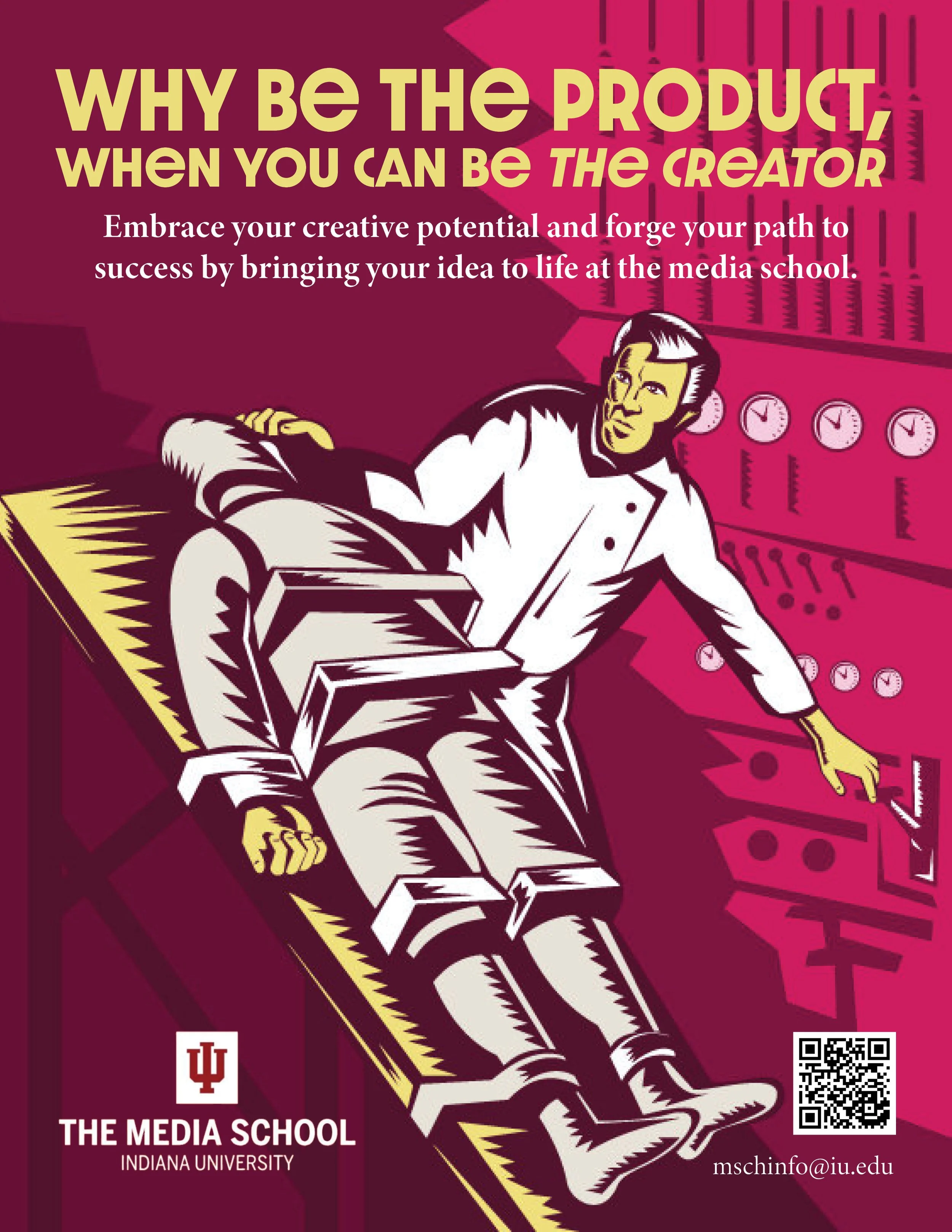 A Halloween-themed poster encouraging Indiana University students from other majors to see media as a field of creativity, influence, and real-world impact, not a backup plan, but a powerful career path worth switching to.